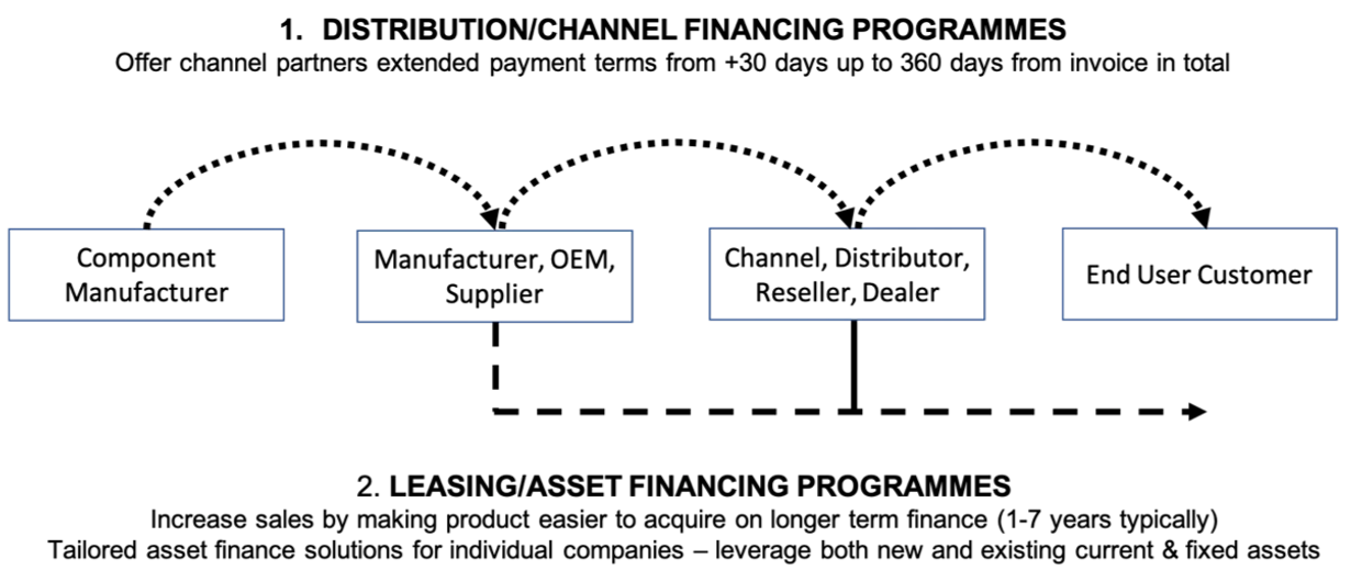 Solutions can be developed to help vendors and manufacturers move product more efficiently through their distribution channels in a manner that meets both the balance sheet and working capital objectives of both the supplier and their partners, providing 1) real commercial differentiation from the competition by offering increased payment terms 2) whilst potentially outsourcing the risk of non-payment to a financial partner and 3) simultaneously reducing DSO